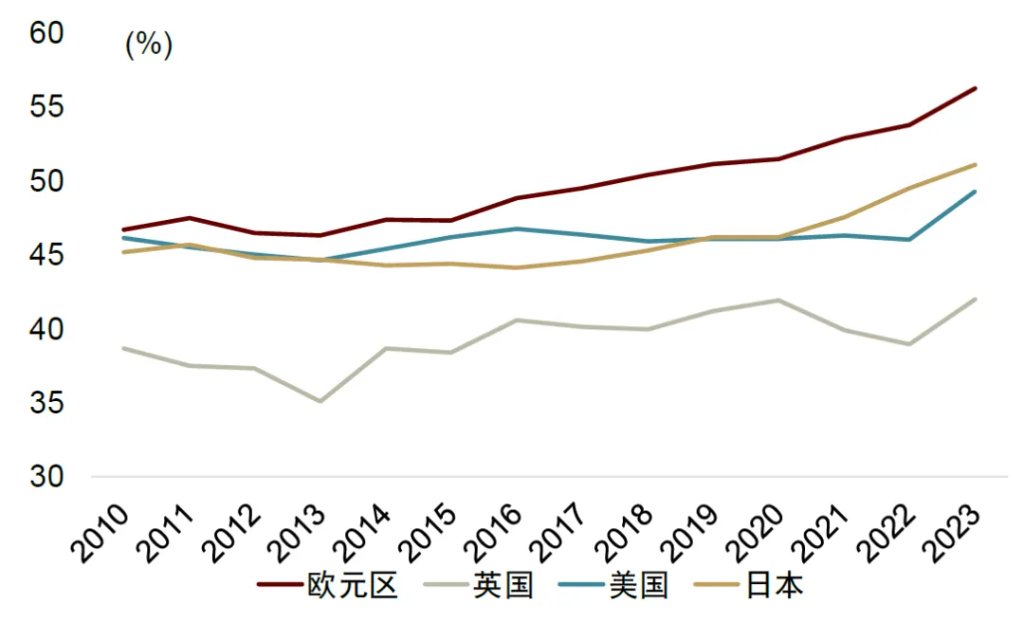 从2019年到2024年,我国出口占全球出口的名义份额从13.1%提升到14.6%。如果考虑实际出口,份额提升更多(图表6)。2024年,我国经常账户的顺差占GDP比例为2.2%,实际上2020年以来整体保持稳定(图表7)。2020-2024年,我国货物贸易顺差占GDP比例保持在3%以上。同期,有些贸易伙伴经常账户顺差收窄。例如,2022年欧元区经常账户顺差转为经常账户逆差,特别是货物贸易顺差大幅下降(图表8)。日本虽然国际收支中初次收入上升,但货物贸易由顺差转为逆差,其经常账户顺差在2022年也减小(图表9)。